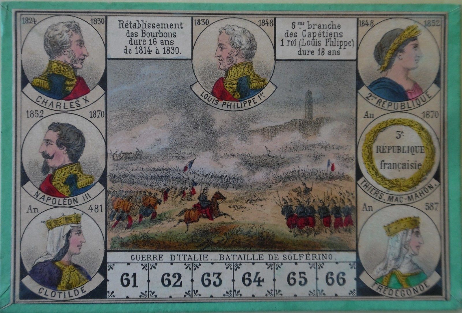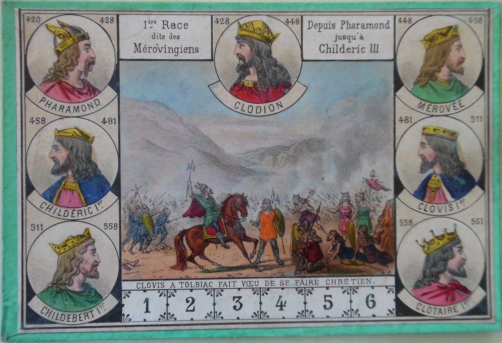 le carton ci-dessus fait partie d'une série de 12 qui était proposée sur ebay à un prix excessif , mais une entente avec le vendeur m'en a permis l'acquisition a prix raisonnable...j'avais identifié ces cartons comme étant une édition de Saussine, qui exploitera ces gravures pour de nombreuses éditions que nous allons évoquer...le carton 11 permet une datation du jeu en évoquant en médaillon la 3ème République et Mac-Mahon (1873-1879); le carton 12 présente des figures féminines , et l'illustration centrale nous ramène à Clovis thème du carton 1: